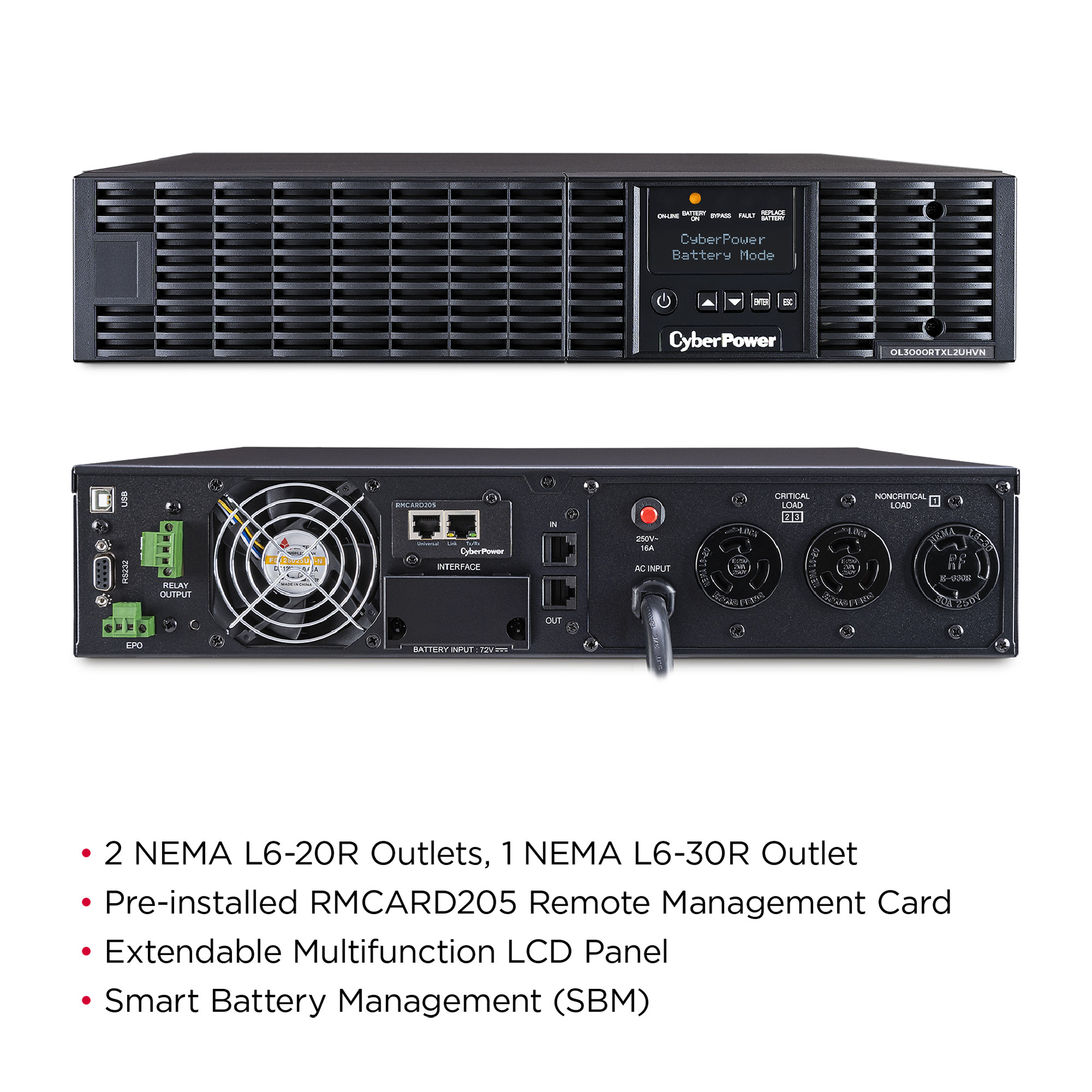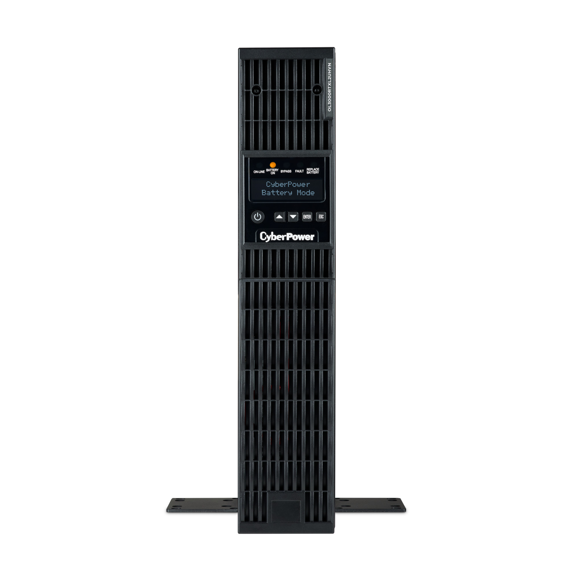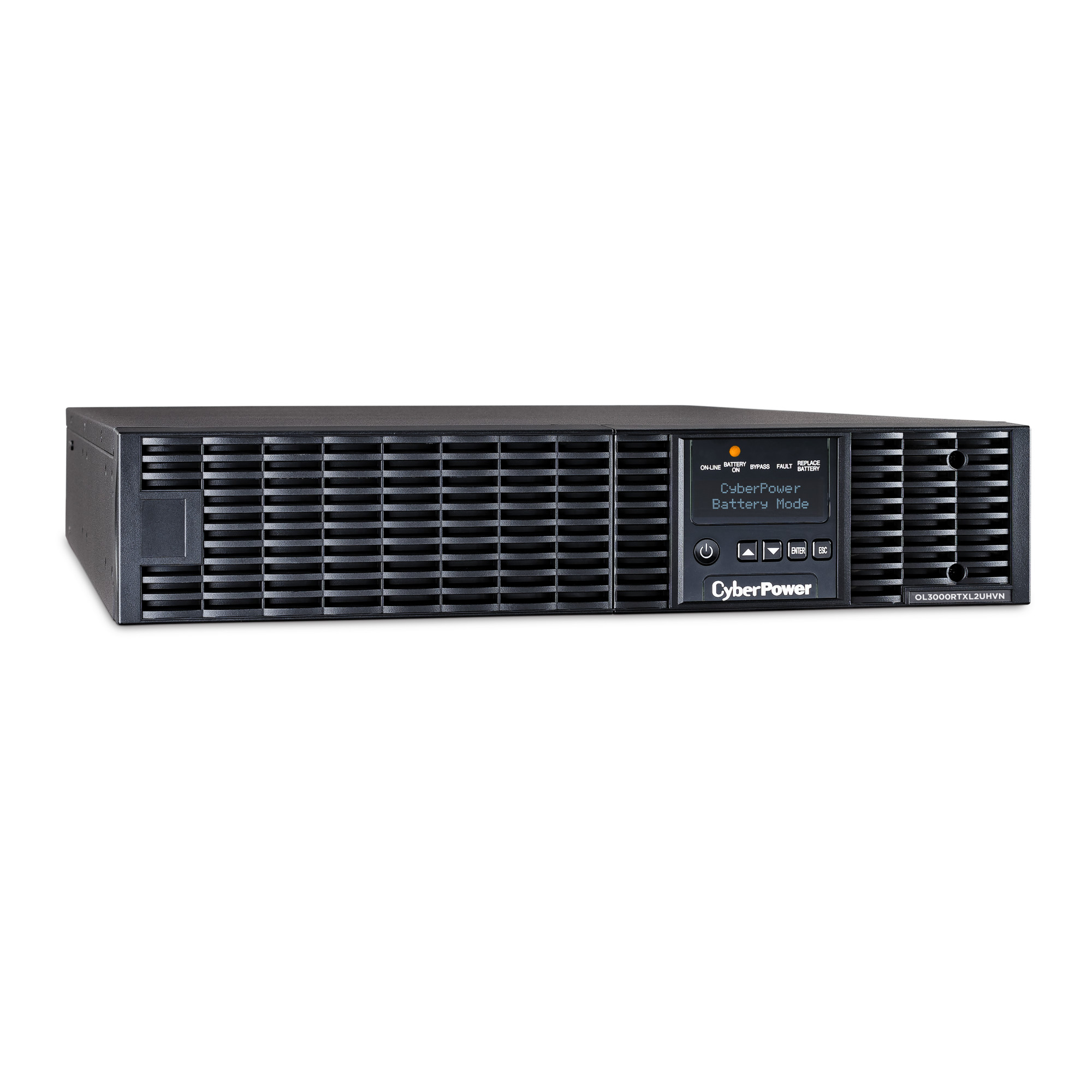 The CyberPower OL3000RTXL2UHVN is a rack/tower UPS with double conversion topology. It provides sine wave output to critical applications and equipment that require seamless power correction. The Extended Battery Module (EBM) expands runtime, and Fast Charge Technology restores full backup power faster. This model comes with an extendable LCD control panel, Smart Battery Management charging technology, and energy-saving GreenPower UPS™ ECO Mode.
