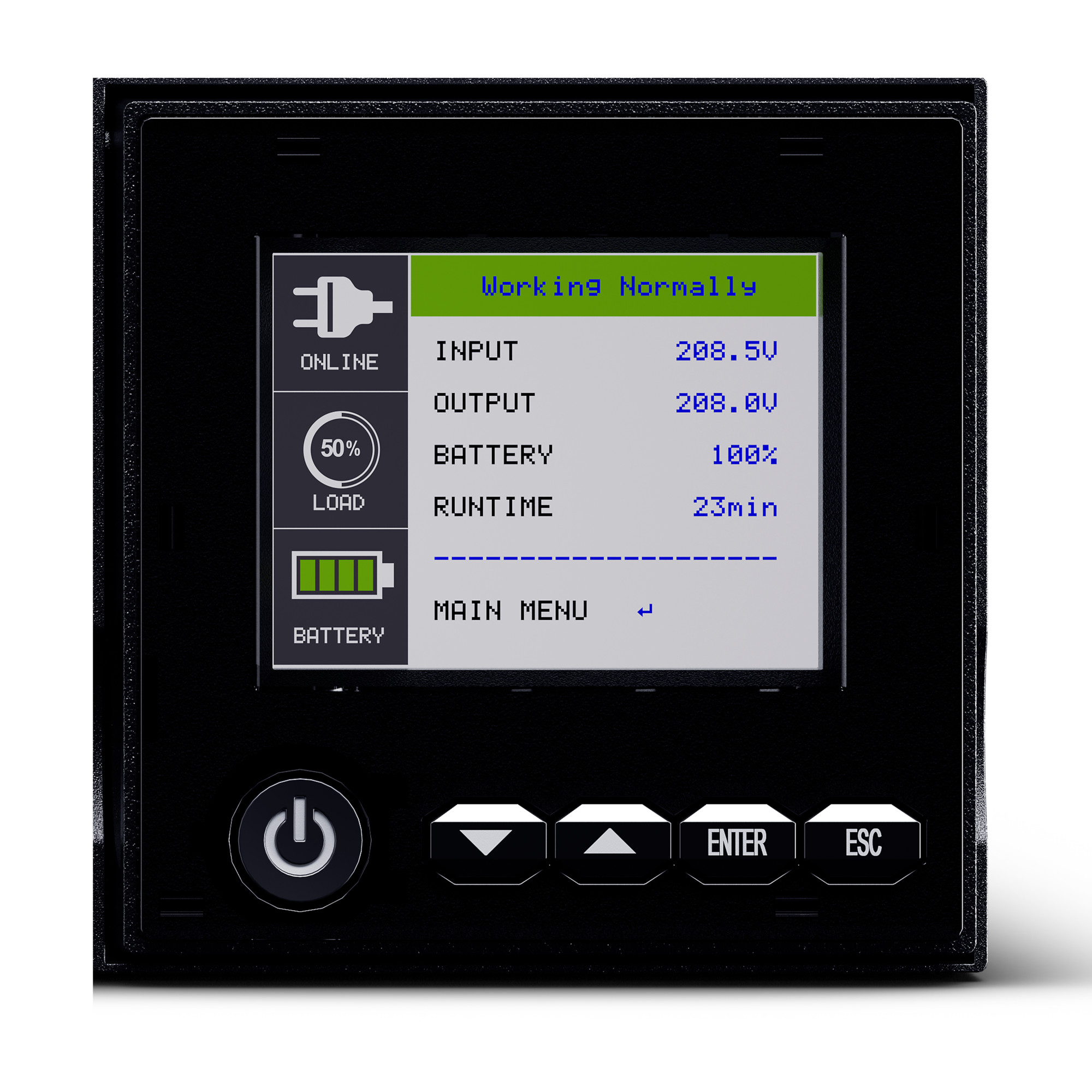 For monitoring, this UPS offers a new state-of-the-art, multi-function, color TFT LCD screen that is simple to set up and easy to use. The color-coded alerts provide clear status of the UPS and the screen orientation rotates automatically when placed into a tower configuration.