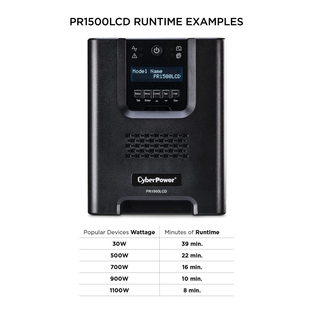 A mini-tower UPS with line interactive topology, the CyberPower Smart App Sinewave PR1500LCD provides battery backup, power protection (using sine wave output), and surge protection for corporate servers, department servers, storage appliances, network devices, and telecom installations requiring Active PFC power source compatibility. The PR1500LCD uses Automatic Voltage Regulation (AVR) to correct minor power fluctuations without switching to battery power, which extends battery life. AVR is essential in areas where power fluctuations occur frequently. The PR1500LCD comes with a three-year warranty and a $375,000 Connected Equipment Guarantee.
