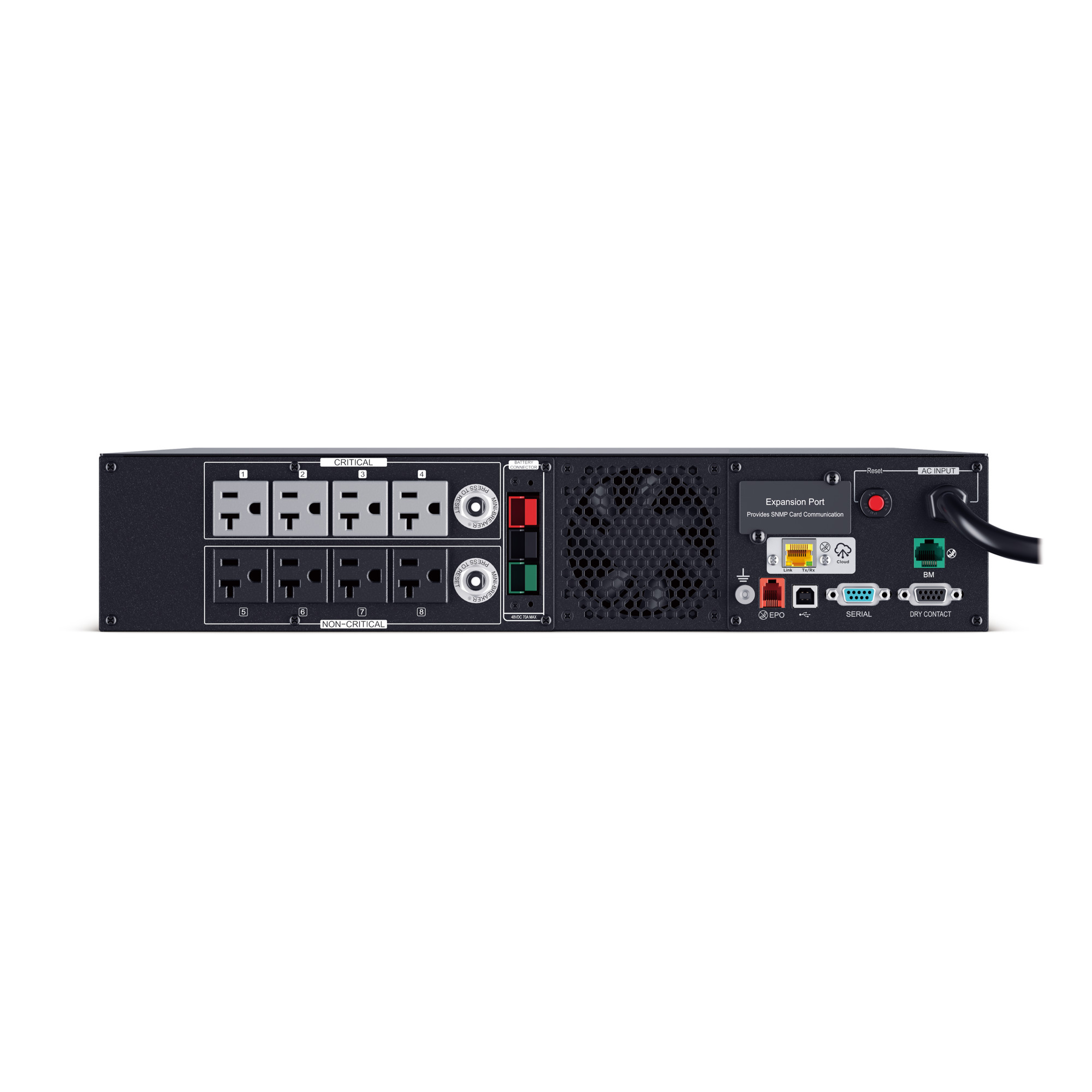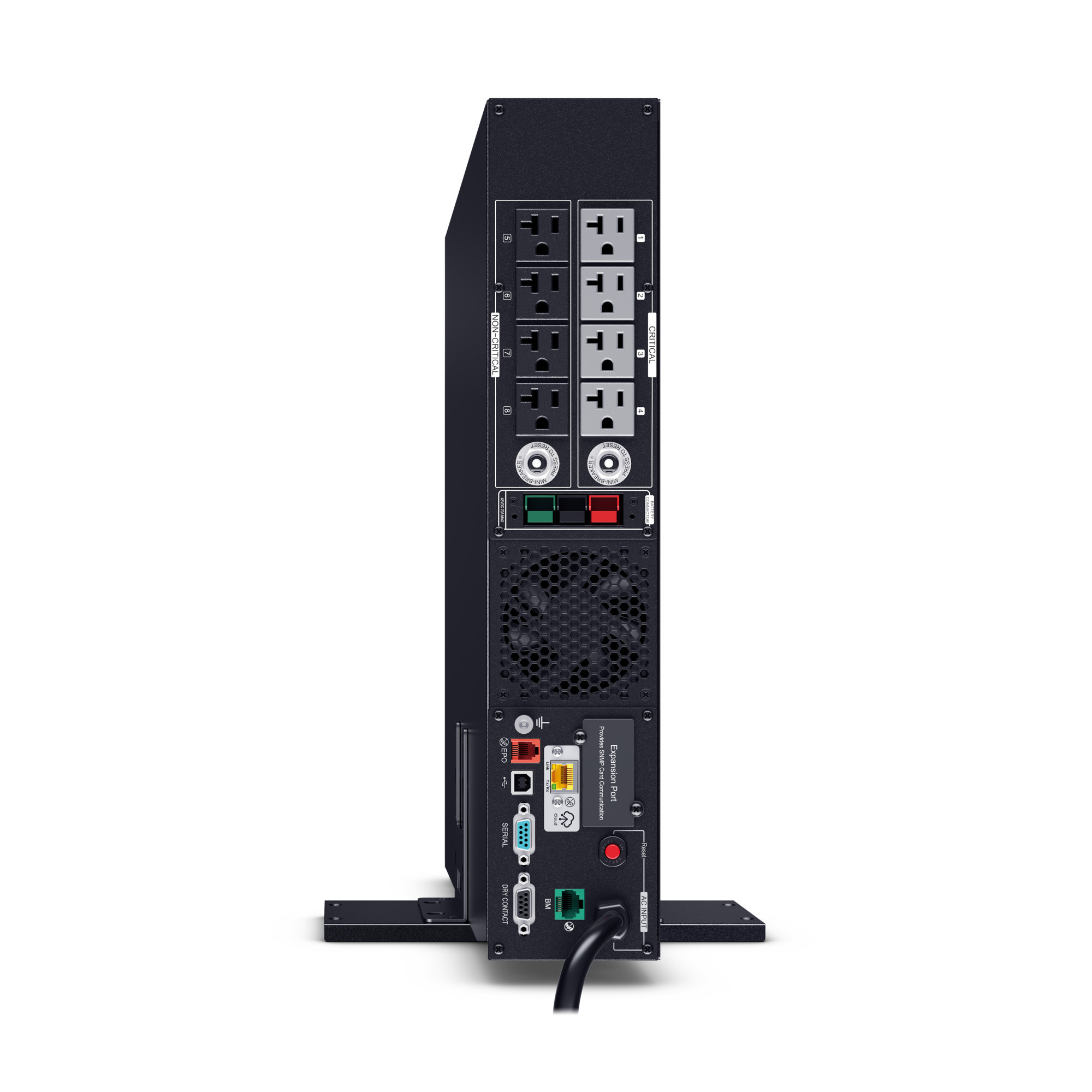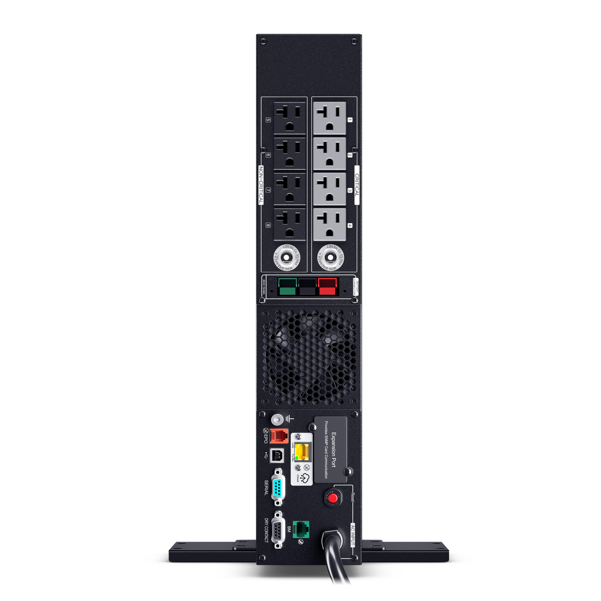 This model accepts the BP48VP2U02 Extended Battery Module (EBM) for expanded runtime during power outages and optional RMCARD205 network management card for remote management and control via a standard web browser or network management system. Built-in Cloud Monitoring.