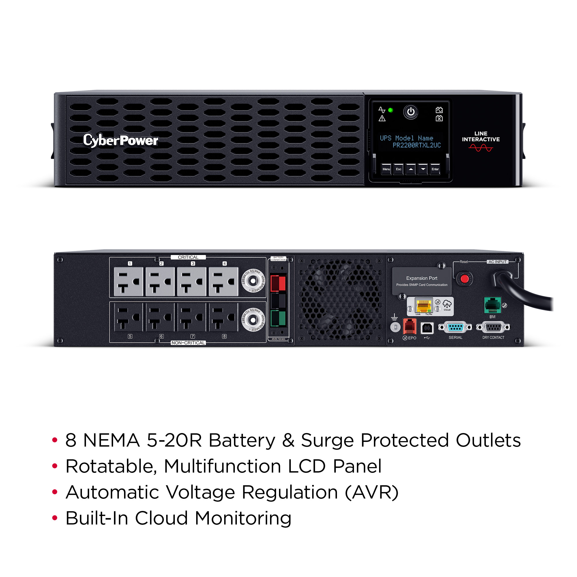 The PR2000RTXL2UC is a Smart App Sinewave rack/tower convertible UPS with line-interactive topology, surge protection, and battery backup. CyberPower’s Smart App Sinewave series has sine wave output to eliminate power gaps that can be detected by sensitive equipment and cause unexpected shutdowns.