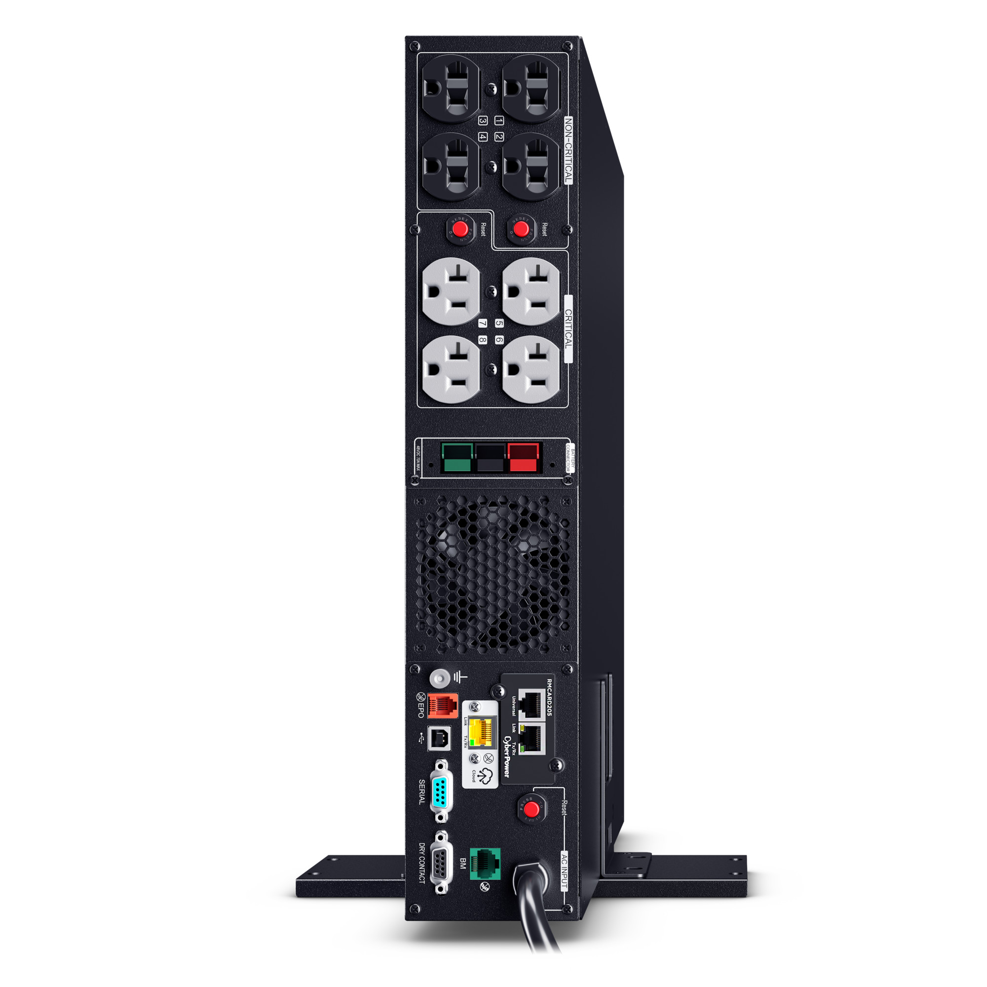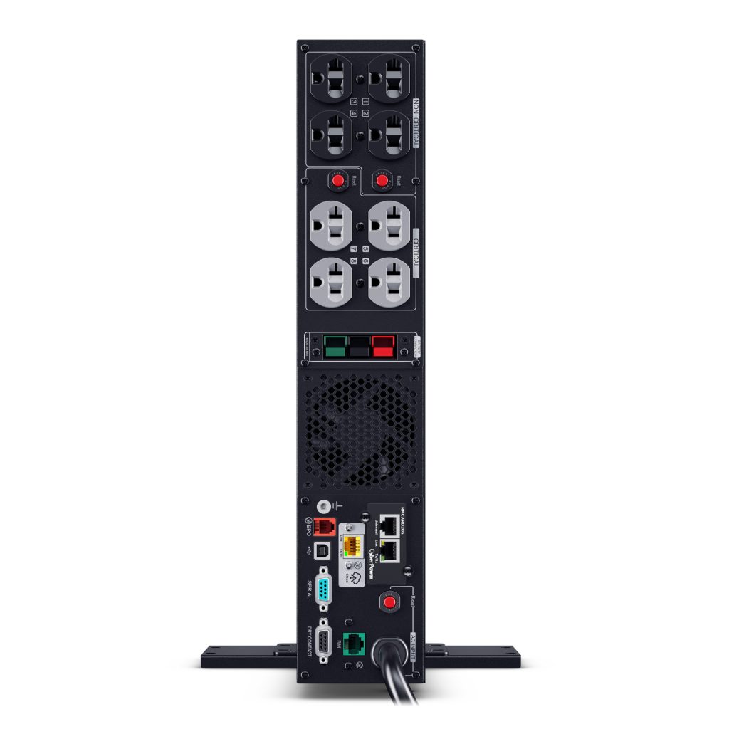 This model accepts the BP48VP2U02 Extended Battery Module (EBM) for expanded runtime during power outages and includes pre-installed RMCARD205 network management card for remote management and control via a standard web browser or network management system. Built-in Cloud Monitoring.