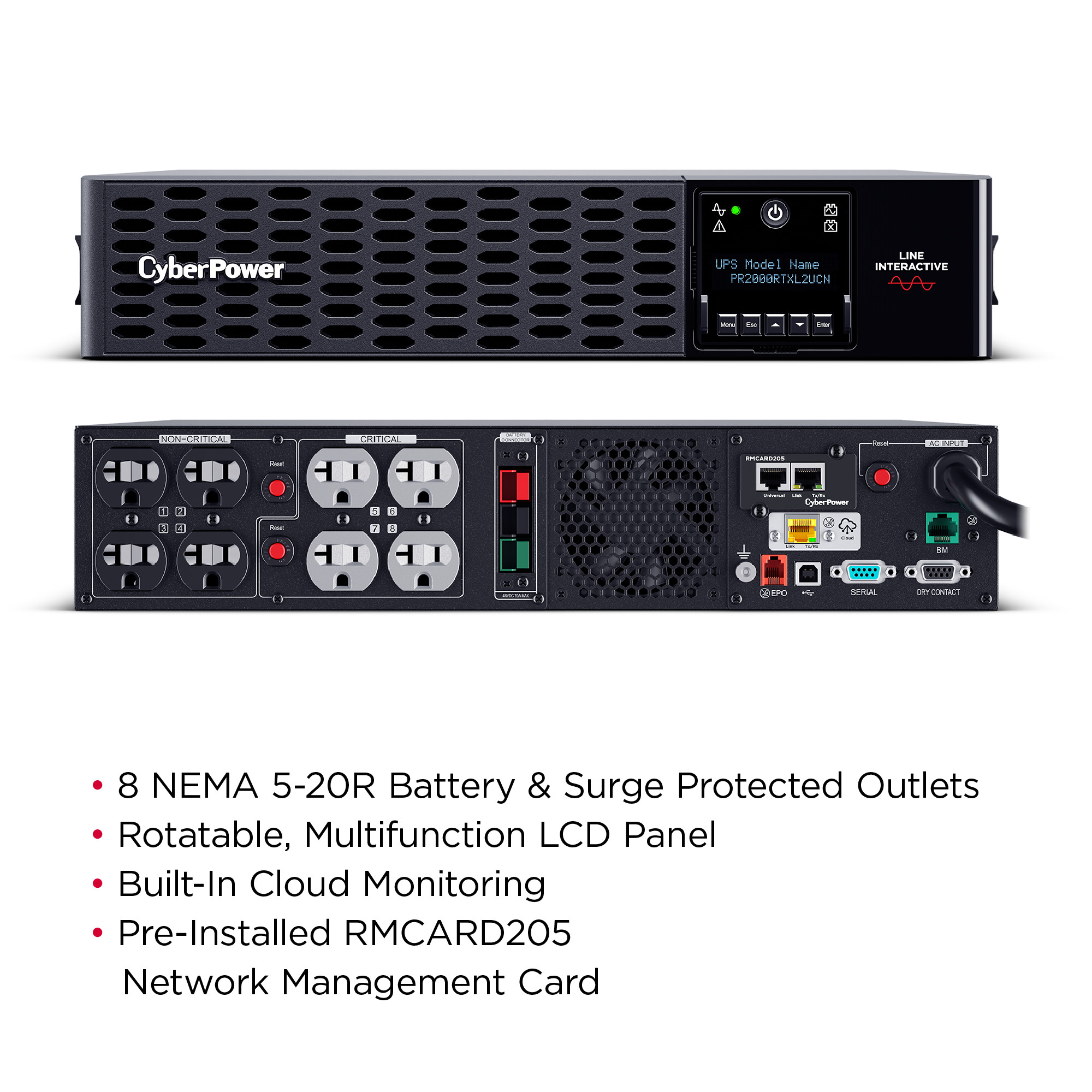 The PR2000RTXL2UCN is a Smart App Sinewave rack/tower convertible UPS with line-interactive topology, surge protection, and battery backup. CyberPower’s Smart App Sinewave series has sine wave output to eliminate power gaps that can be detected by sensitive equipment and cause unexpected shutdowns.