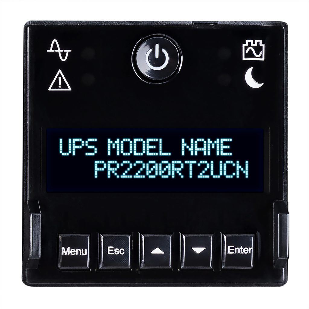 The Smart App Sinewave PR2200RT2UCN improves battery life through battery equalization technology and Automatic Voltage Regulation (AVR), which corrects minor power fluctuations without switching to battery power. The enhanced chassis design with an easy-to-access toolless front panel, captive screws for battery panel access, and color-coded rear panel make battery changes and installations simple and fast. The PR2200RT2UCN also has an innovative LCD panel that rotates 90°, tilts for a better viewing angle, and provides information on 47 different settings including UPS stats, UPS setup and control management, and testing options.