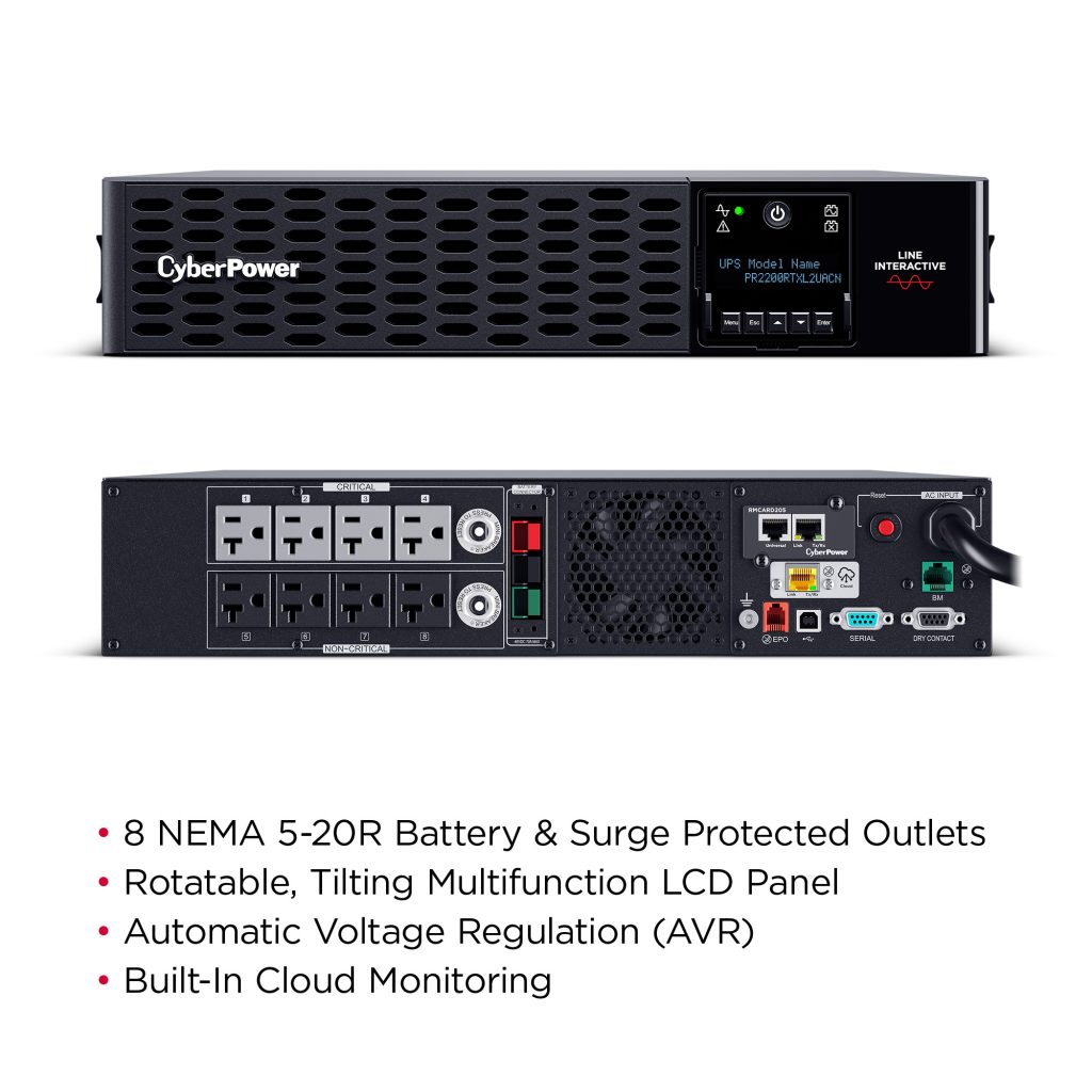 The PR2200RTXL2UACN is a Smart App Sinewave rack/tower convertible UPS with line-interactive topology, surge protection, and battery backup. CyberPower’s Smart App Sinewave series creates a sine wave output devoid of power gaps which could cause unexpected shutdowns of sensitive equipment.