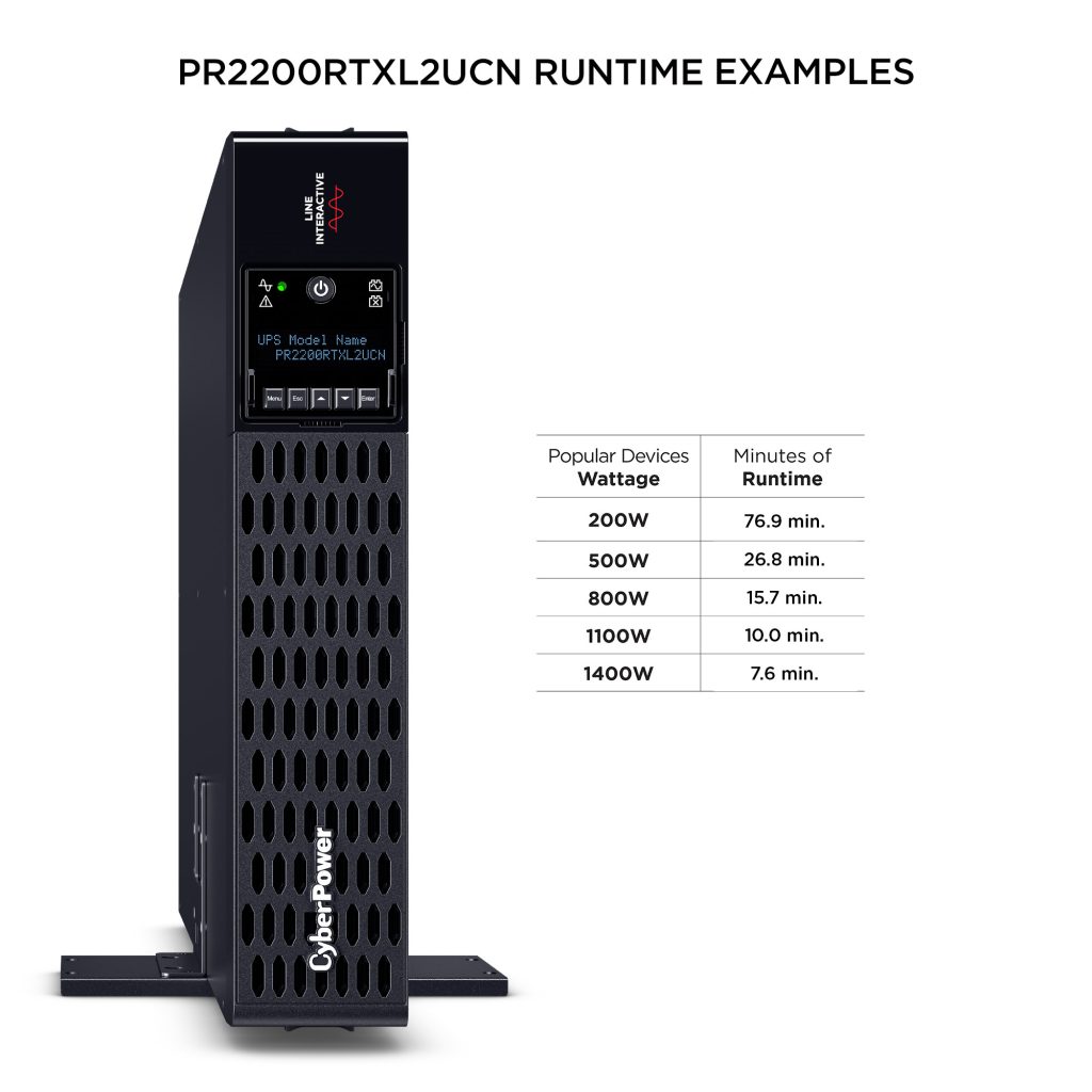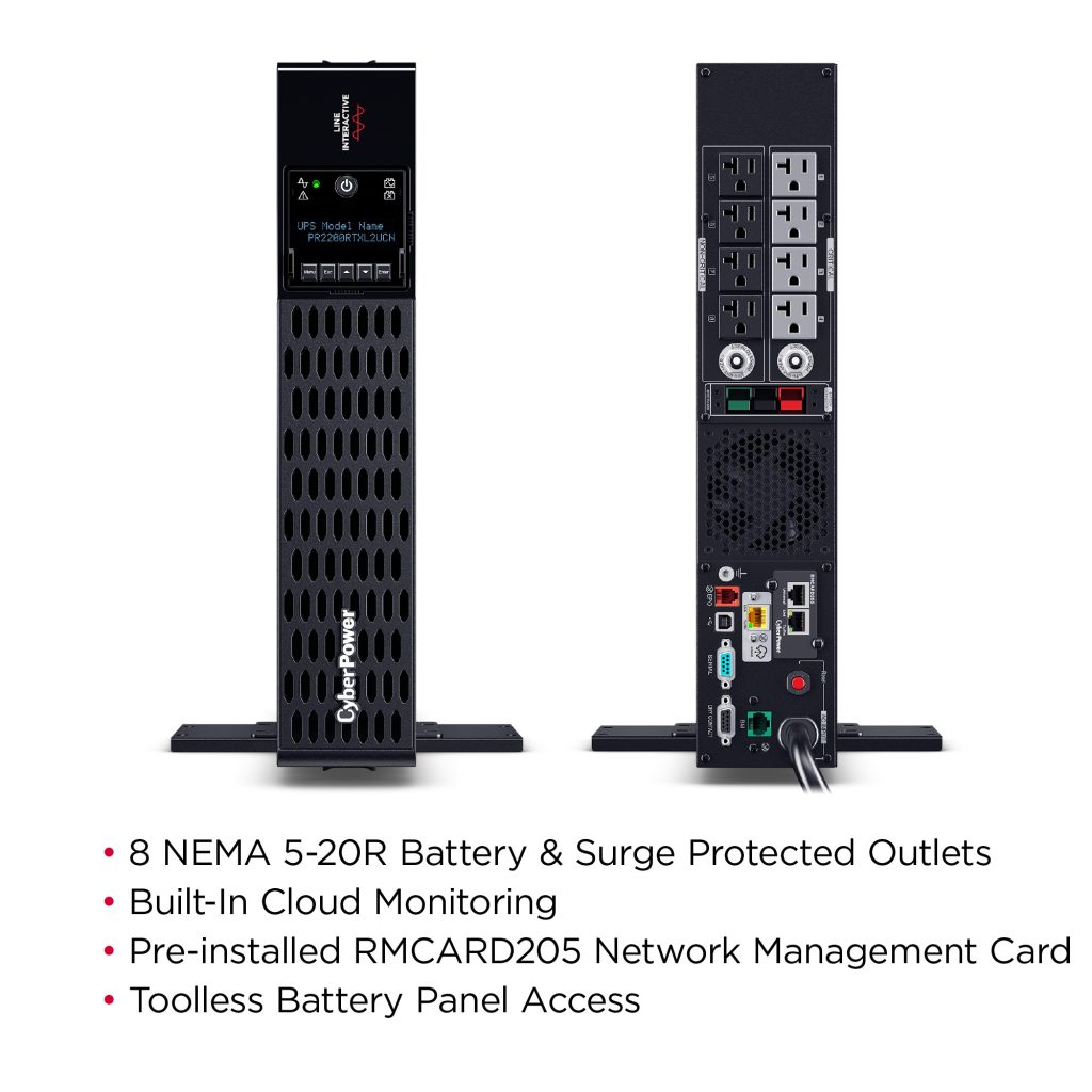 The PR2200RTXL2UCN is a Smart App Sinewave rack/tower convertible UPS with line-interactive topology, surge protection, and battery backup. CyberPower’s Smart App Sinewave series creates a sine wave output devoid of power gaps which could cause unexpected shutdowns of sensitive equipment.
