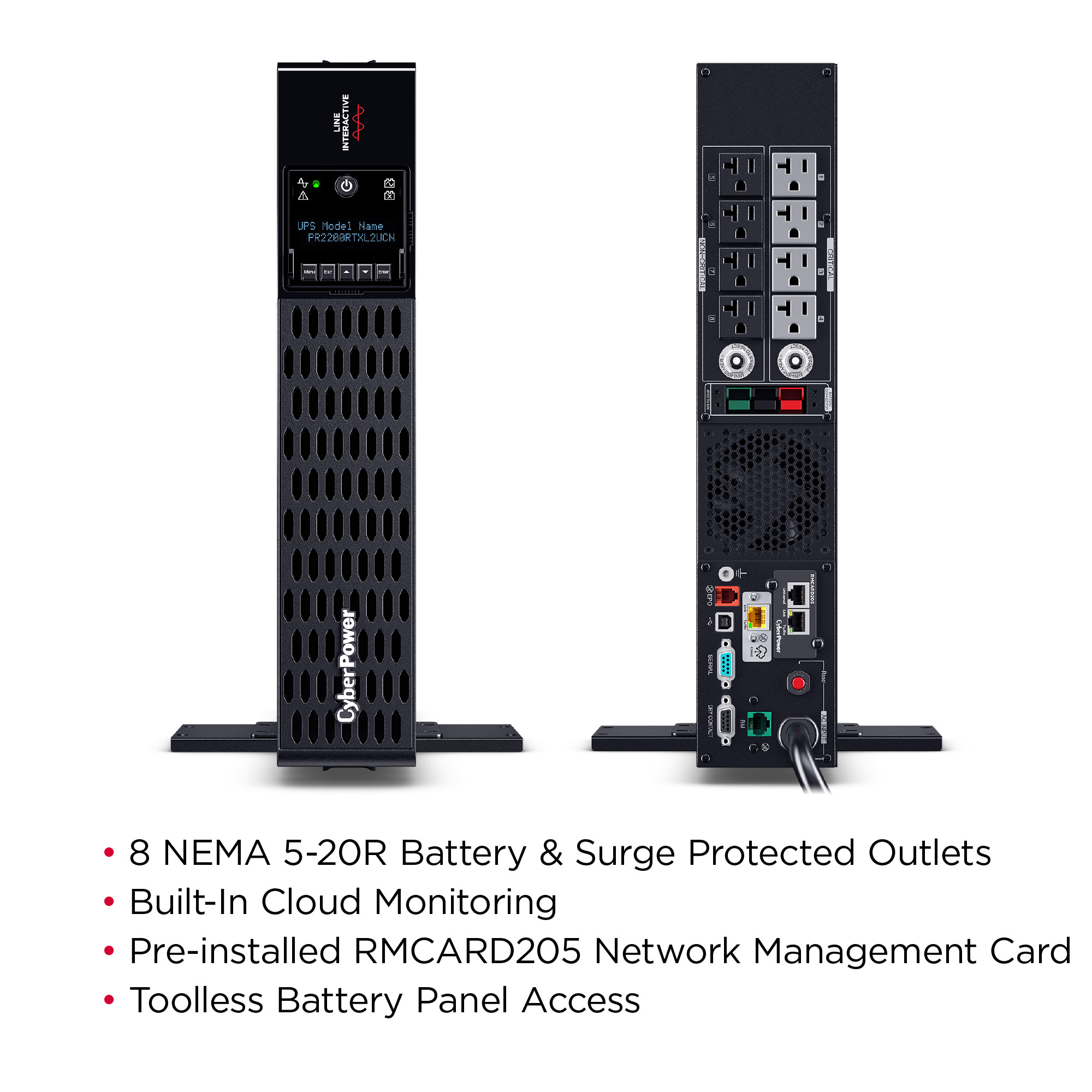 This model accepts the BP48VP2U02 Extended Battery Module (EBM) for expanded runtime during power outages and includes pre-installed RMCARD205 network management card for remote management and control via a standard web browser or network management system. Includes built-in cloud monitoring.