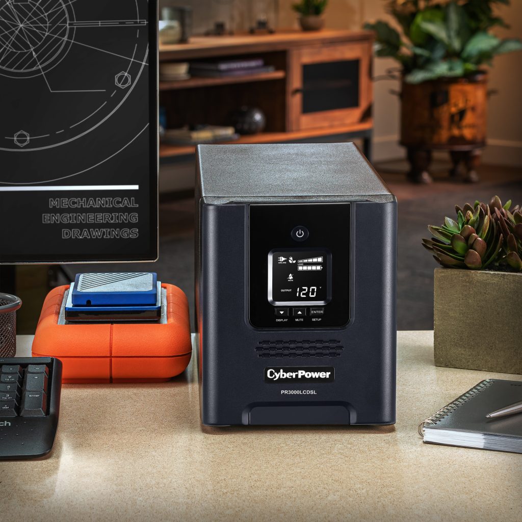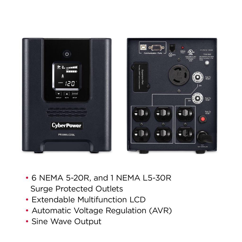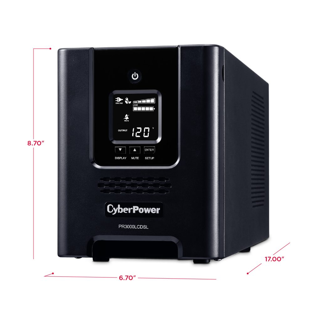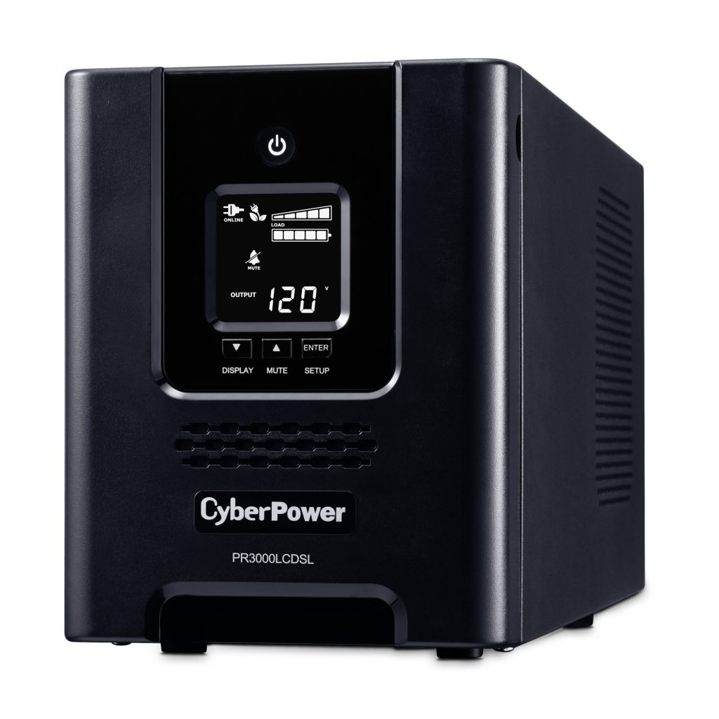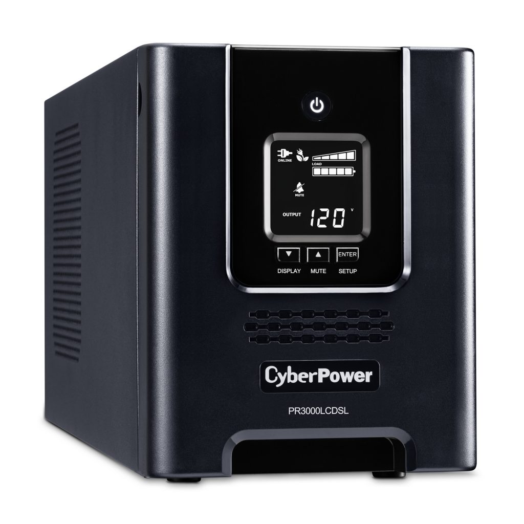 A mini-tower UPS with line interactive topology, the CyberPower Smart App Sinewave PR3000LCDSL provides battery backup, power protection (using sine wave output), and surge protection for corporate servers, department servers, storage appliances, network devices, and telecom installations requiring Active PFC power source compatibility. The PR3000LCDSL uses Automatic Voltage Regulation (AVR) to correct minor power fluctuations without switching to battery power, which extends battery life. AVR is essential in areas where power fluctuations occur frequently. The PR3000LCDSL comes with a three-year warranty, and a $375,000 Connected Equipment Guarantee.