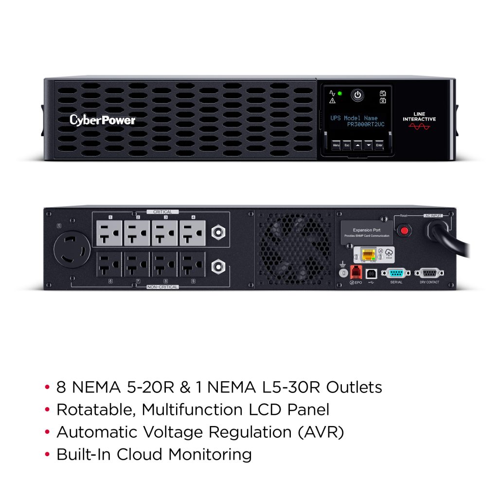 The PR3000RT2UC is a Smart App Sinewave rack/tower convertible UPS with line-interactive topology, surge protection, and battery backup. CyberPower’s Smart App Sinewave series creates a sine wave output devoid of power gaps which could cause unexpected shutdowns of sensitive equipment.