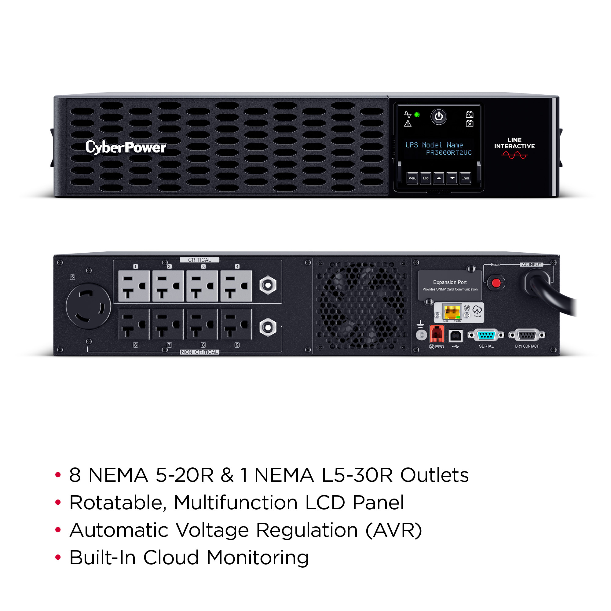 This model accepts the RMCARD205 network management card for remote management and control via a standard web browser or network management system. Includes Built-in Cloud Monitoring