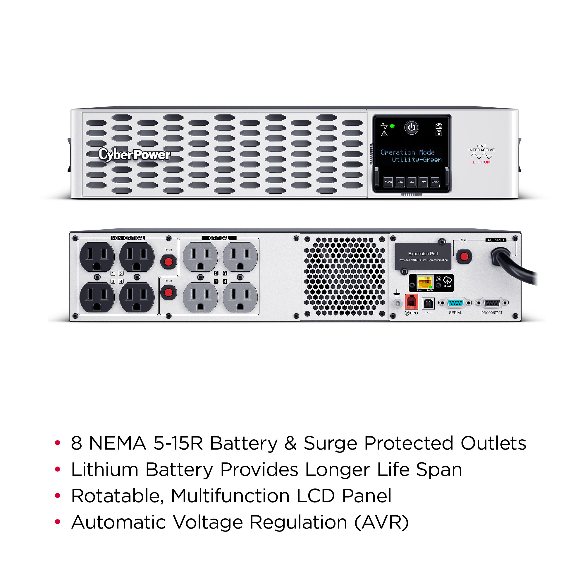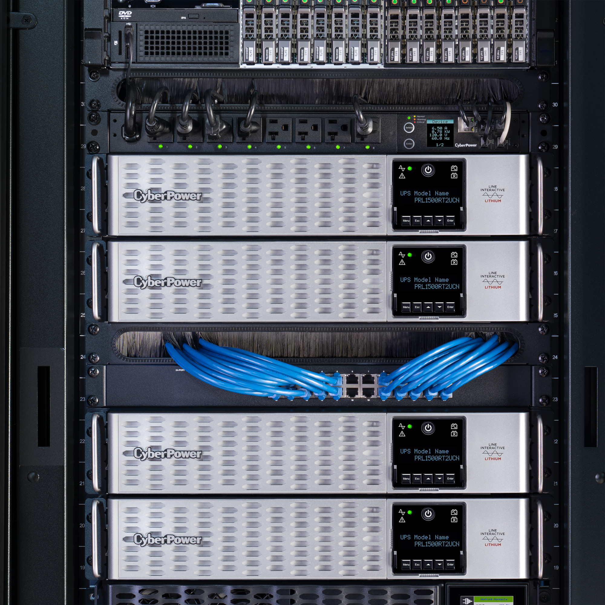 The lithium PRL1500RT2UC is a Smart App Sinewave rack/tower convertible UPS with line-interactive topology, surge protection, and battery backup. CyberPower’s Smart App Sinewave series has sine wave output to eliminate power gaps that can be detected by sensitive equipment and cause unexpected shutdowns.