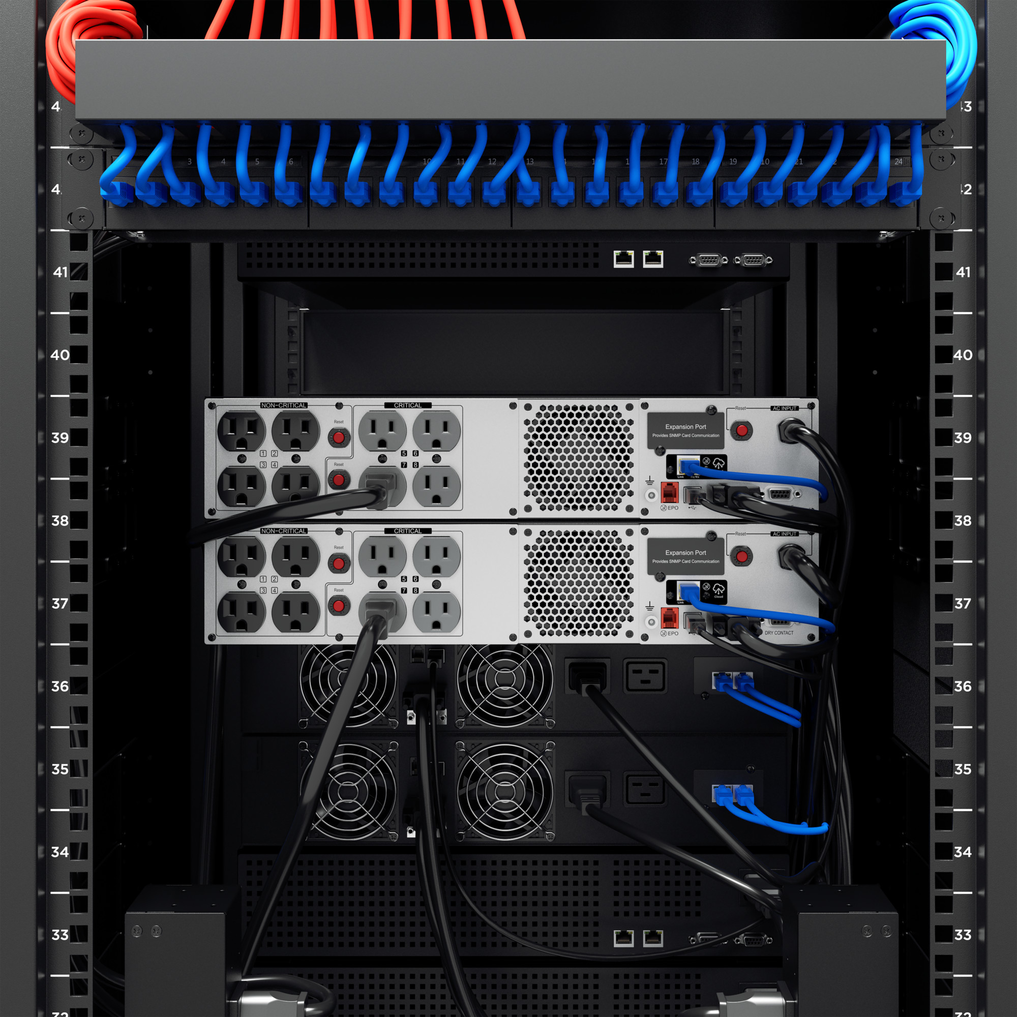 Allows UPS batteries to return to full capacity more rapidly by using a built-in charger inside of each UPS or EBM. - Rotatable Multifunction LCD Panel