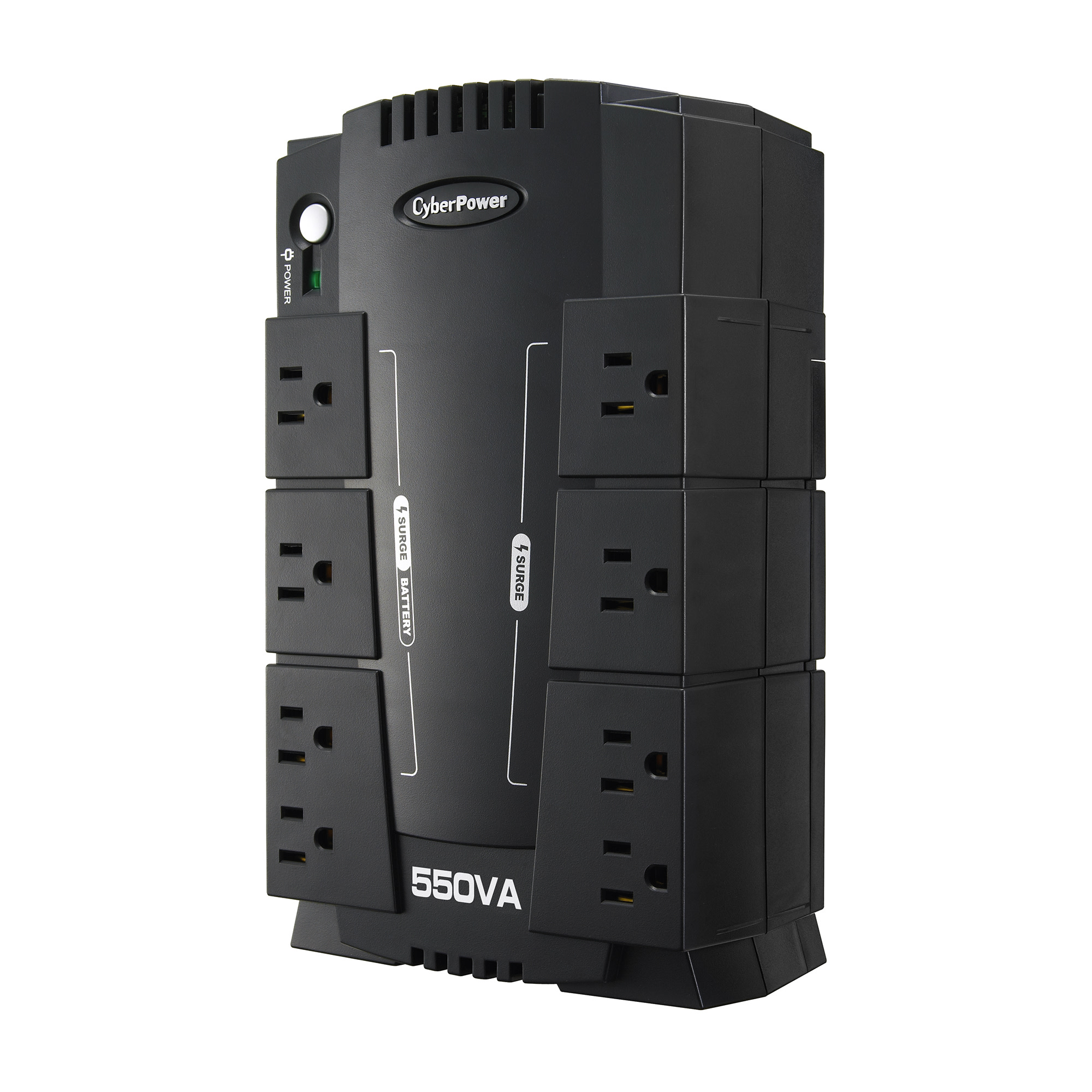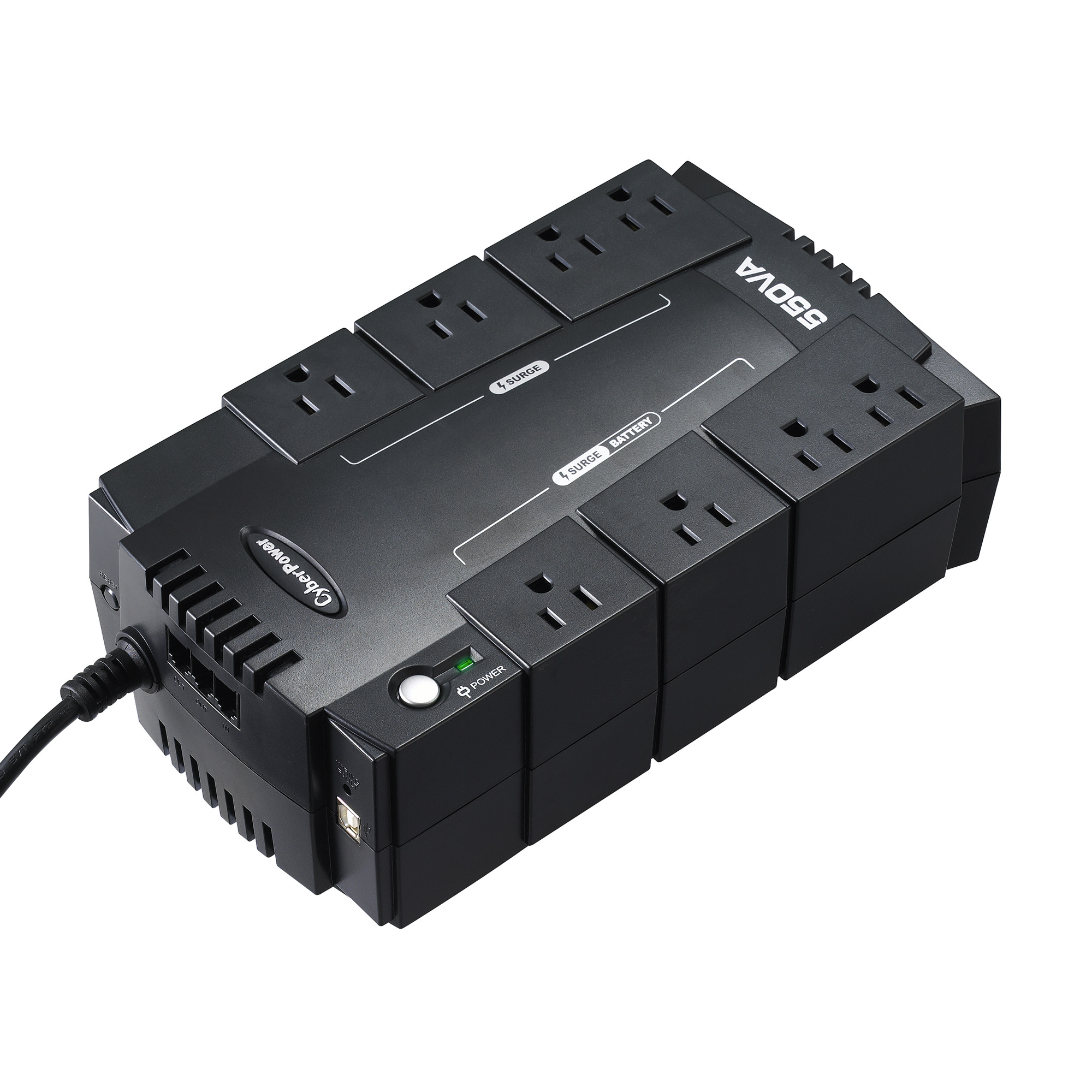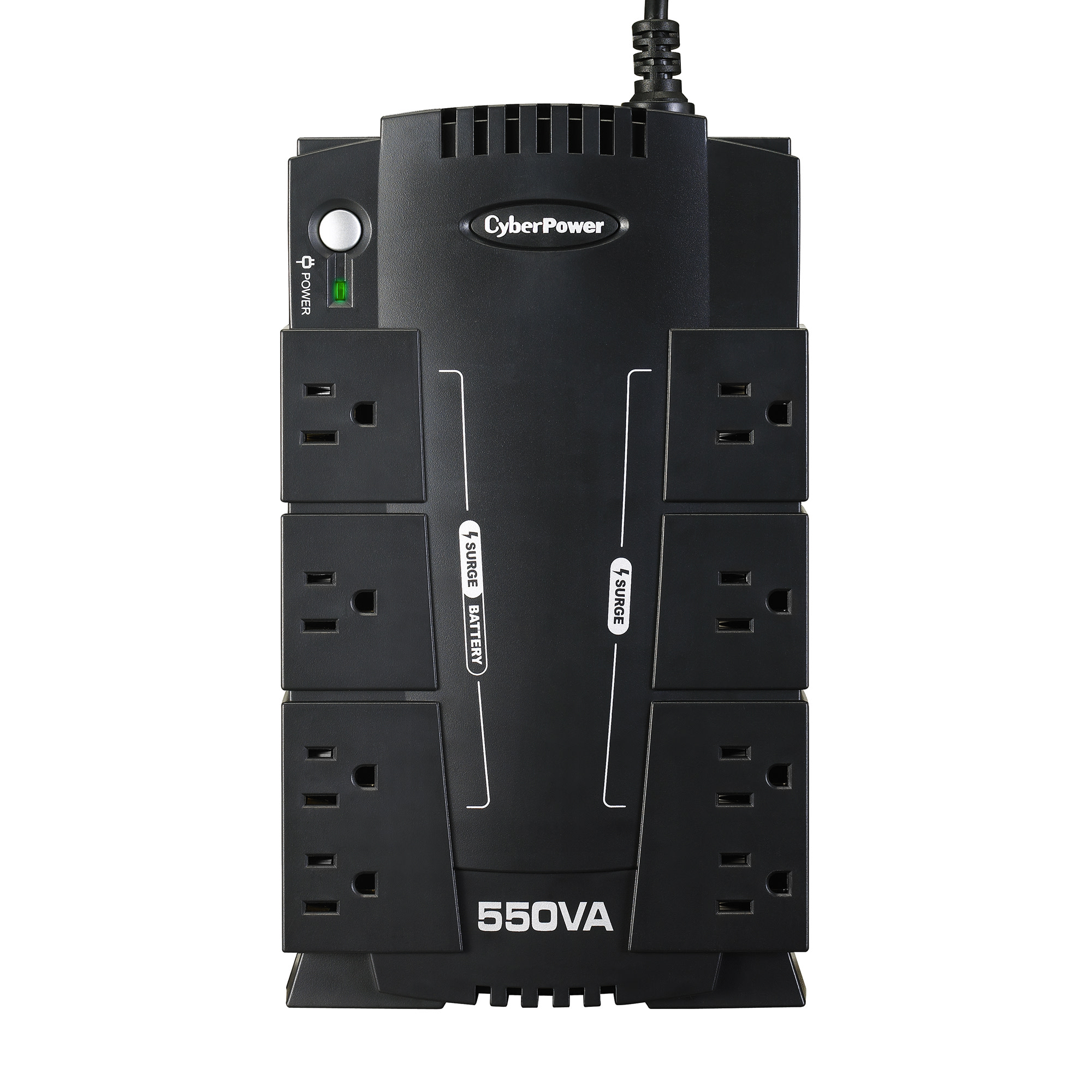 The CyberPower CP550HG Standby uninterruptible power supply (UPS) safeguards home/office computers and other electronics (monitors, scanners, speakers, CD/DVD players, MP3 players and phones) from surges, spikes, sags, brownouts and other power abnormalities. Its composite integrated circuitry offers advanced lightning protection. This UPS system utilizes GreenPower UPS™ high-efficiency design to save on energy costs by reducing energy consumption and heat buildup.