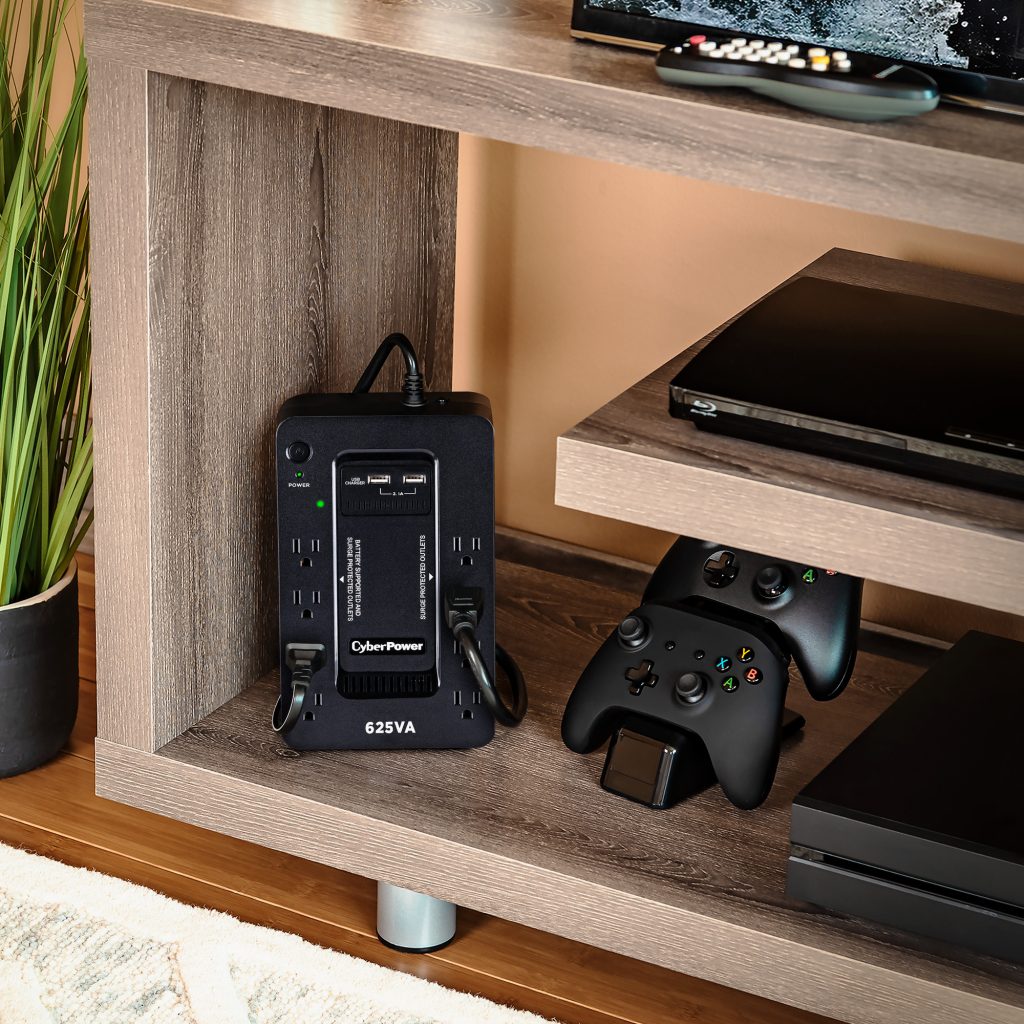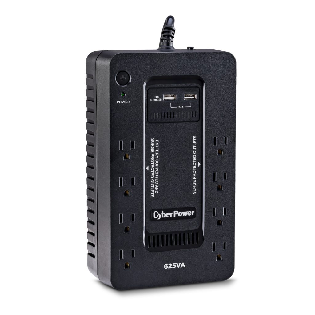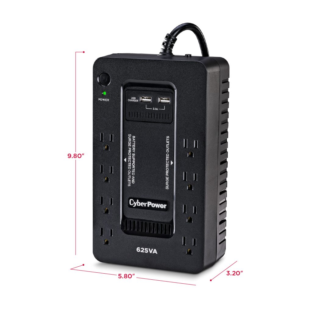 The CyberPower ST625U uninterruptible power supply (UPS) system provides battery backup and surge protection for lightning-induced surges and other power events that can damage electronic equipment. This unit delivers enough battery backup to power connected electronics through utility power failure and enough runtime to perform a graceful shutdown to protect against the loss of data and damage to valuable electronics during longer outages.