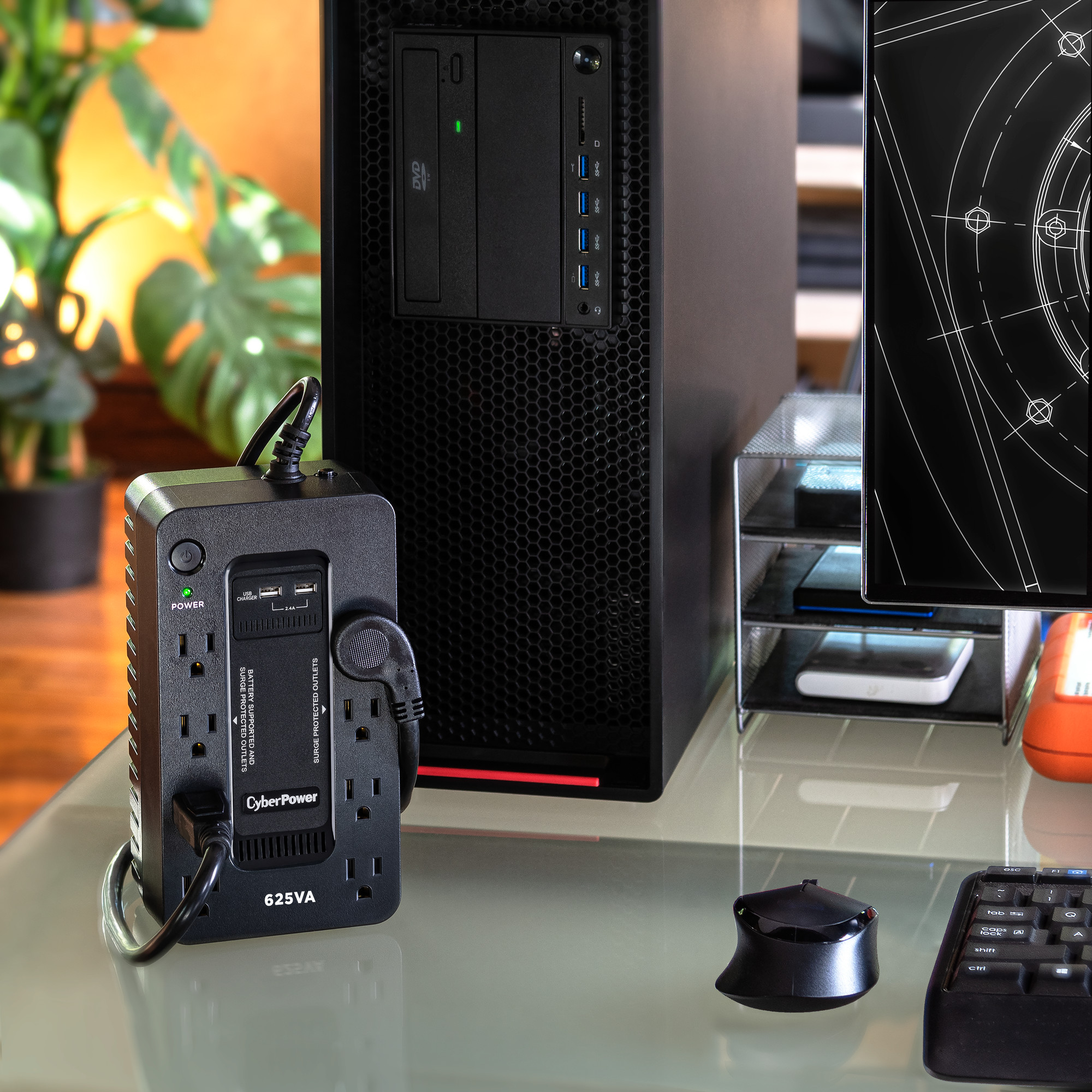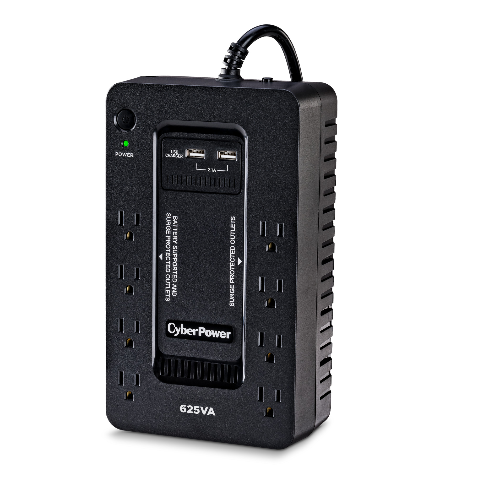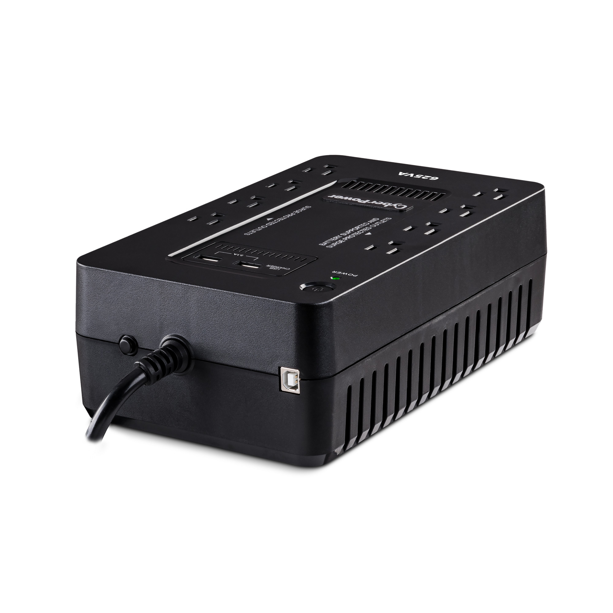 The CyberPower ST625U uninterruptible power supply (UPS) system provides battery backup and surge protection for lightning-induced surges and other power events that can damage electronic equipment. This unit delivers enough battery backup to power connected electronics through utility power failure and enough runtime to perform a graceful shutdown to protect against the loss of data and damage to valuable electronics during longer outages.