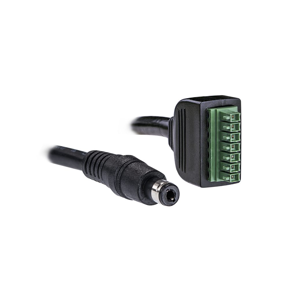 This cable is terminated with a 7-pin, 3.5mm pitch connector and a 5.5mm x 2.5mm DC male power connector. This assembly is designed to connect a battery backup system to a desktop ONT.